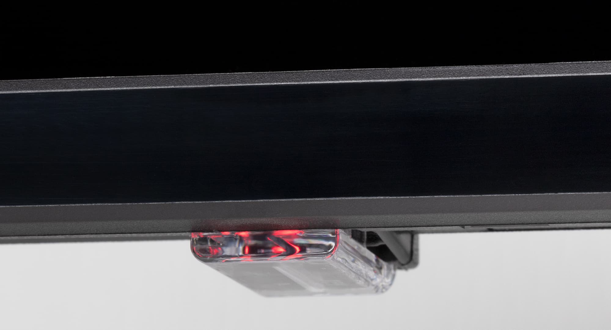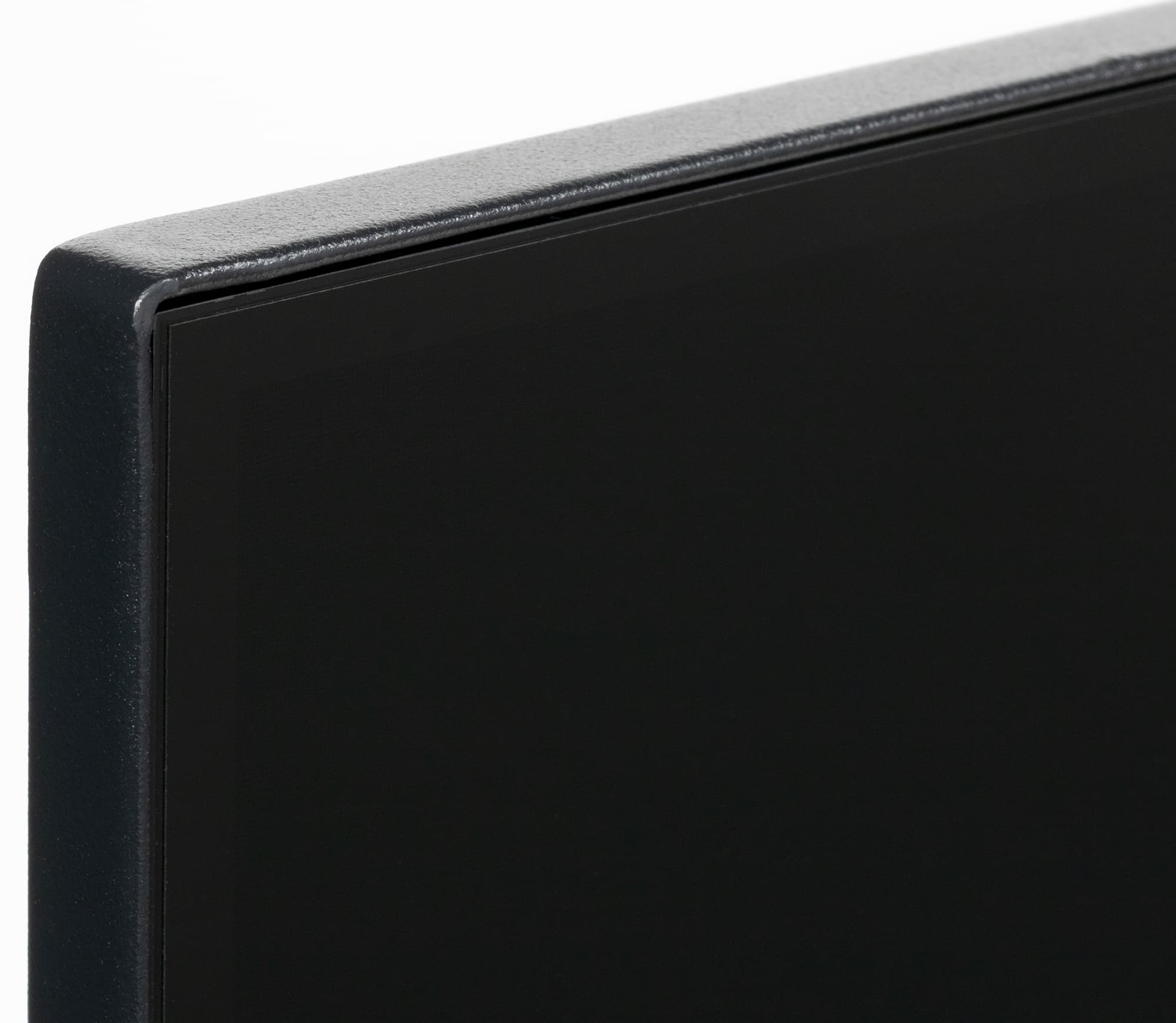 Дизайн строгий, декоративные элементы отсутствуют. Экран визуально безрамочный, он выглядит как монолитная поверхность, ограниченная снизу узкой планкой, а сверху и с боков — узкой окантовкой.
