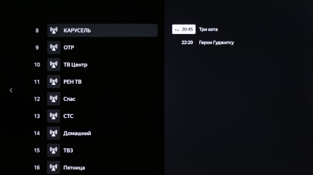 Есть базовая поддержка электронной программы передач — можно посмотреть, что именно идет или будет идти на текущем и других каналах.