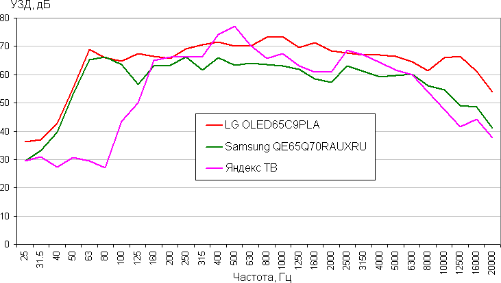 Громкость встроенной акустической системы для жилой комнаты, соответствующей по размерам данной диагонали экрана, достаточная. Стереофонический эффект есть. Присутствуют высокие и средние частоты, низких — практически нет. Явно есть паразитные резонансы корпуса. В целом даже для класса встроенной в телевизор акустики ее качество среднее. Сравним АЧХ этого ТВ с АЧХ двух телевизоров высшего класса (получена с помощью шумомера при воспроизведении звукового файла с розовым шумом, интервал УЗД в 1/3 октавах):