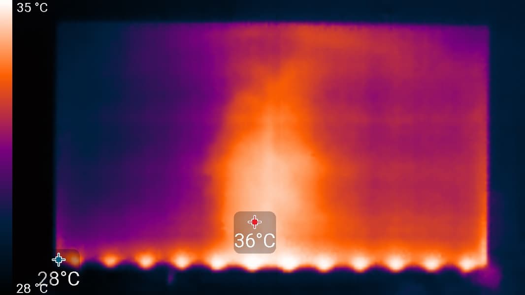 Нагрев телевизора можно оценить по приведенному снимку с ИК-камеры, полученному после долговременной работы на максимальной яркости в помещении с температурой примерно 24 °C: