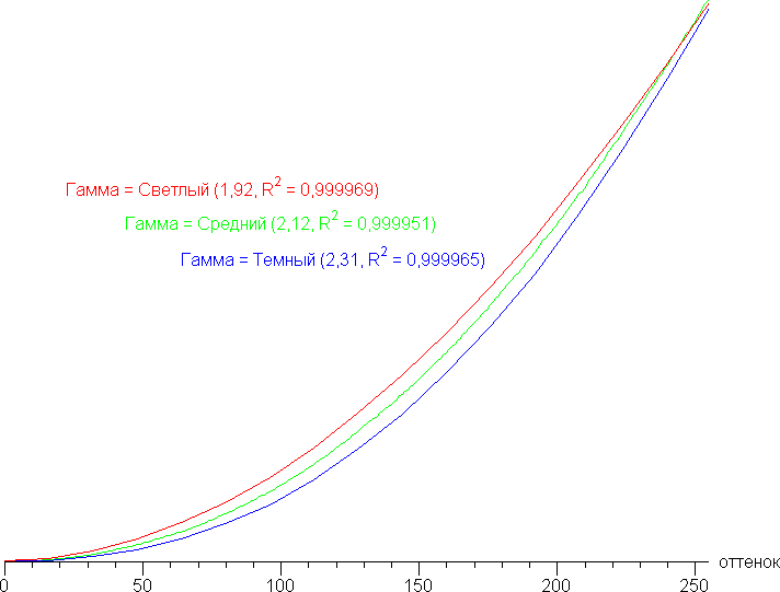 Для оценки характера роста яркости на шкале серого мы измерили яркость 17 оттенков серого при различных значениях параметра Гамма. На графике ниже приведены полученные гамма-кривые (значения показателей аппроксимирующей функции приведены в скобках в подписях, там же — коэффициент детерминации):