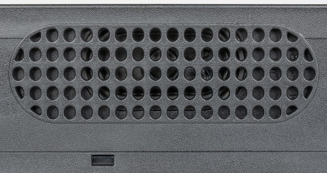 На пластиковом кожухе сзади, сверху и снизу есть вентиляционные решетки. За решетками на нижнем торце можно разглядеть пару громкоговорителей с вытянутыми диффузорами.