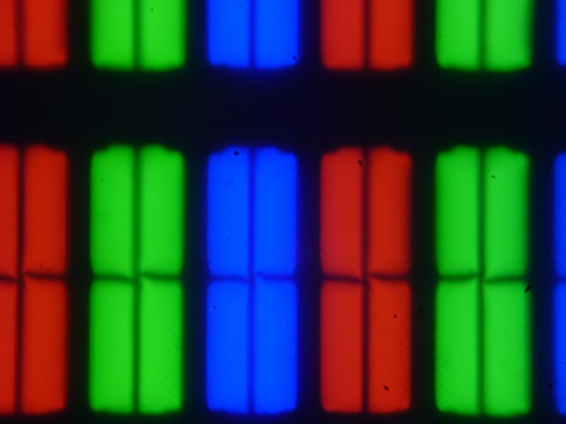 Выявленные характеристики экрана позволяют предположить, что в данном телевизоре установлена матрица типа *VA. Микрофотографии не противоречат этому (черные точки — это пыль на матрице фотоаппарата):