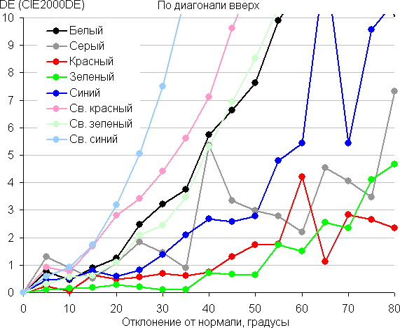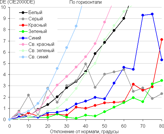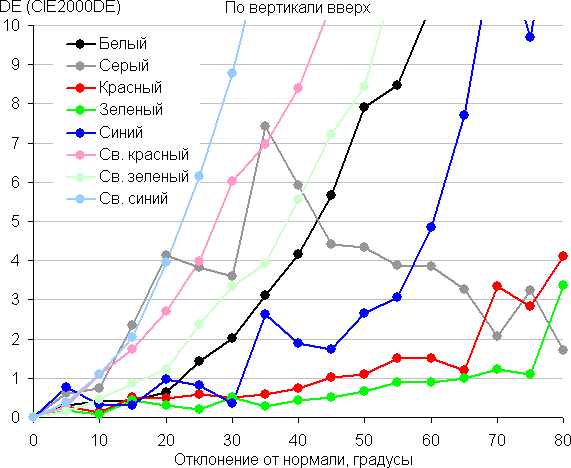 Для количественной характеристики изменения цветопередачи мы провели колориметрические измерения для белого, серого (127, 127, 127), красного, зеленого и синего, а также светло-красного, светло-зеленого и светло-синего полей во весь экран с использованием установки, подобной той, что применялась в предыдущем тесте. Измерения проводились в диапазоне углов от 0° (датчик направлен перпендикулярно к экрану) до 80° с шагом в 5°. Полученные значения интенсивностей были пересчитаны в отклонение ΔE относительно замера каждого поля при перпендикулярном положении датчика относительно экрана. Результаты представлены ниже:
