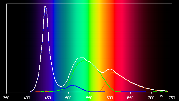 Такой спектр с относительно узким пиком синего и с широкими горбами зеленого и красного цветов характерен для ЖК-матриц, в которых используется белая светодиодная подсветка с синим излучателем и желтым люминофором.