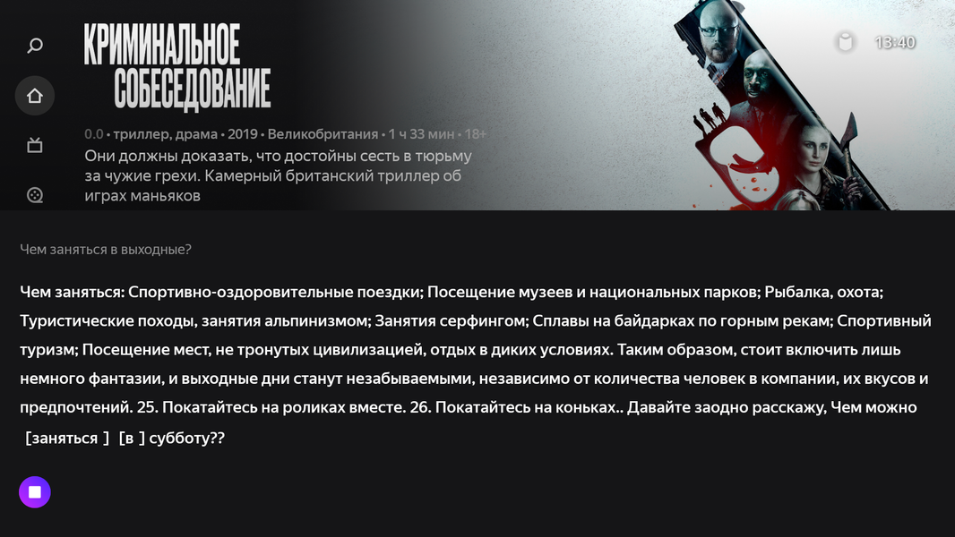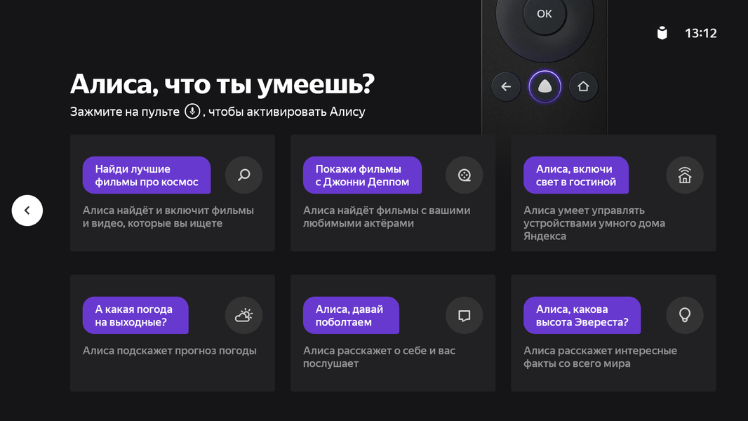 Алиса в этом телевизоре слушает пользователя только тогда, когда он нажал и удерживает кнопку с изображением микрофона на пульте. Другого способа активировать голосового помощника нет. Алису можно попросить найти фильм или сериал по названию, фильмы с определенным актером и т. д. Она умеет переключаться на телевизионный канал по его названию, в том числе на эфирные каналы, и запускать некоторые приложения. Также Алиса может ответить на некоторые вопросы.