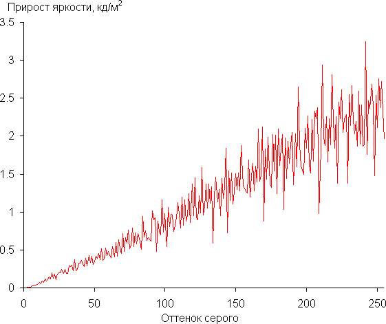 Реальная гамма-кривая ближе к стандартной в случае варианта Средний, поэтому далее мы измерили яркость 256 оттенков серого (от 0, 0, 0 до 255, 255, 255) при этом значении (снизив значение настройки Контраст до 48, чтобы в светах не было завала на один оттенок). График ниже показывает прирост (не абсолютное значение!) яркости между соседними полутонами: