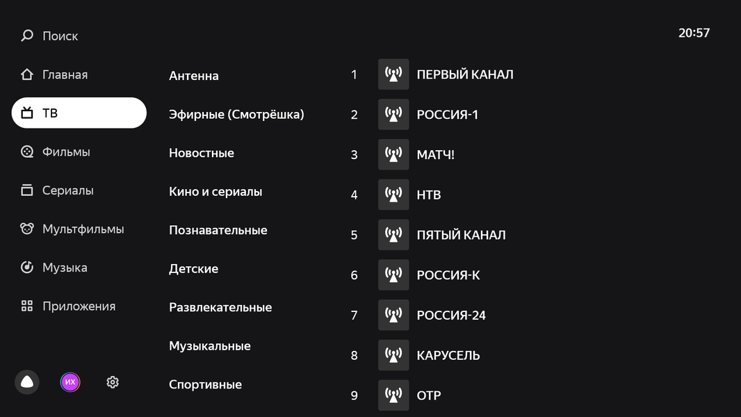 Меню на домашней странице позволяет перейти к вводу поискового запроса, к списку телевизионных каналов, среди которых будут как спутниковые, кабельные и эфирные, так и интернет-телеканалы, для просмотра которых антенна не нужна, но в случае некоторых понадобится платная подписка.