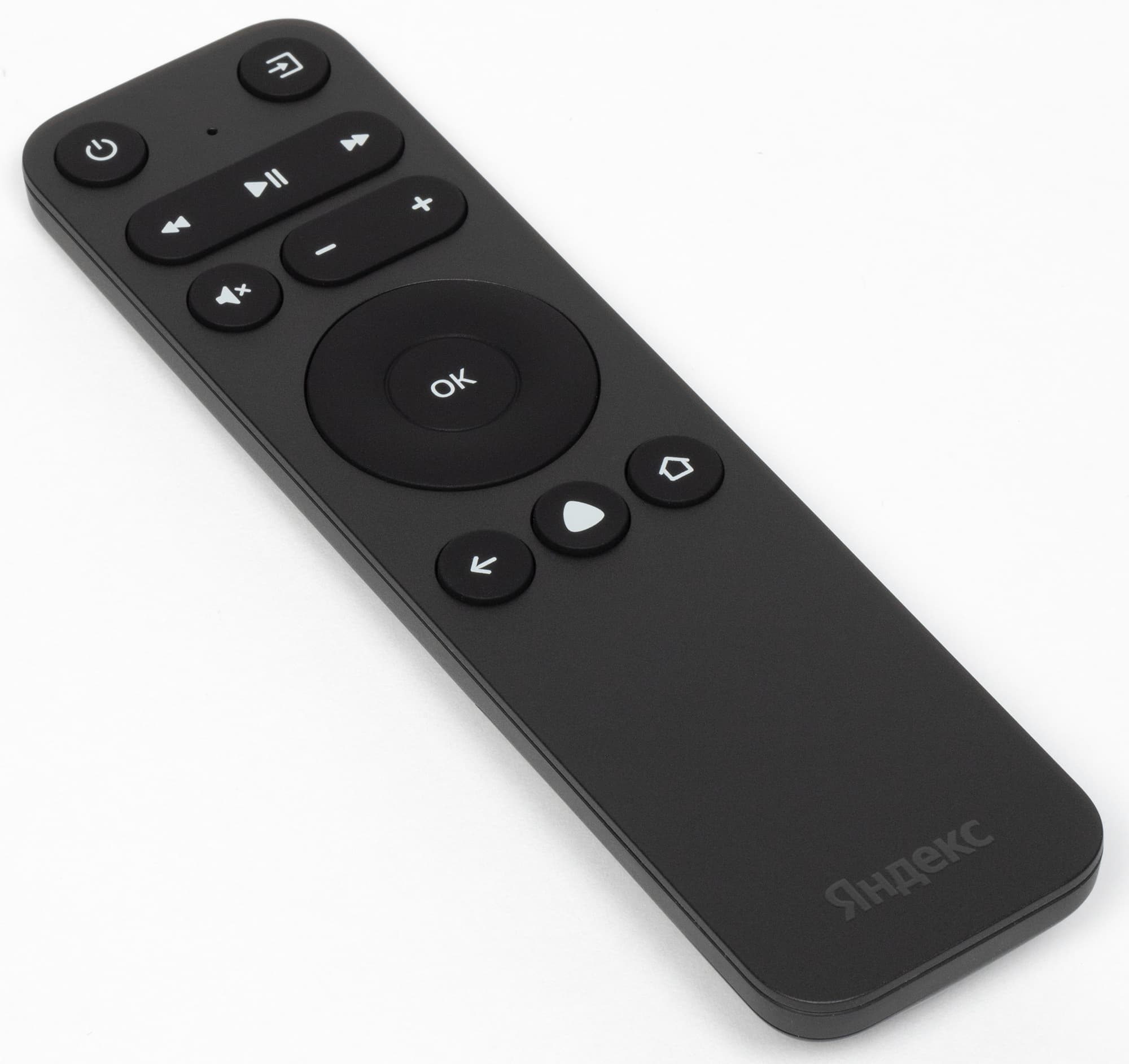 Пульт небольшой (15,4×4,2×1,7 см — по данным производителя) и легкий (50 г без элементов питания). Корпус пульта изготовлен из черного пластика с матовой поверхностью. Кнопки изготовлены из резиноподобного материала. Обозначения кнопок достаточно контрастные и крупные. Самих кнопок немного, но организация интерфейса и не очень богатая функциональная оснащенность не дают особого повода сожалеть об отсутствии дополнительных кнопок. Пульт гибридный, он может работать как по ИК, так и по Bluetooth. По ИК пульт работает до сопряжения с телевизором или тогда, когда телевизор находится в глубоком сне. Во всех остальных случаях ИК-передатчик не работает, и команды передаются по Bluetooth. В передней части пульта рядом с индикатором есть отверстие микрофона.