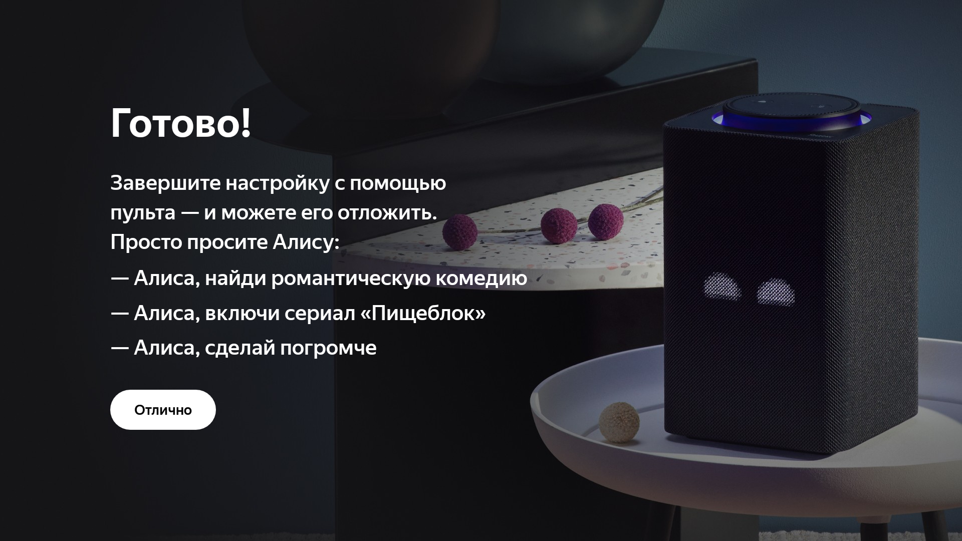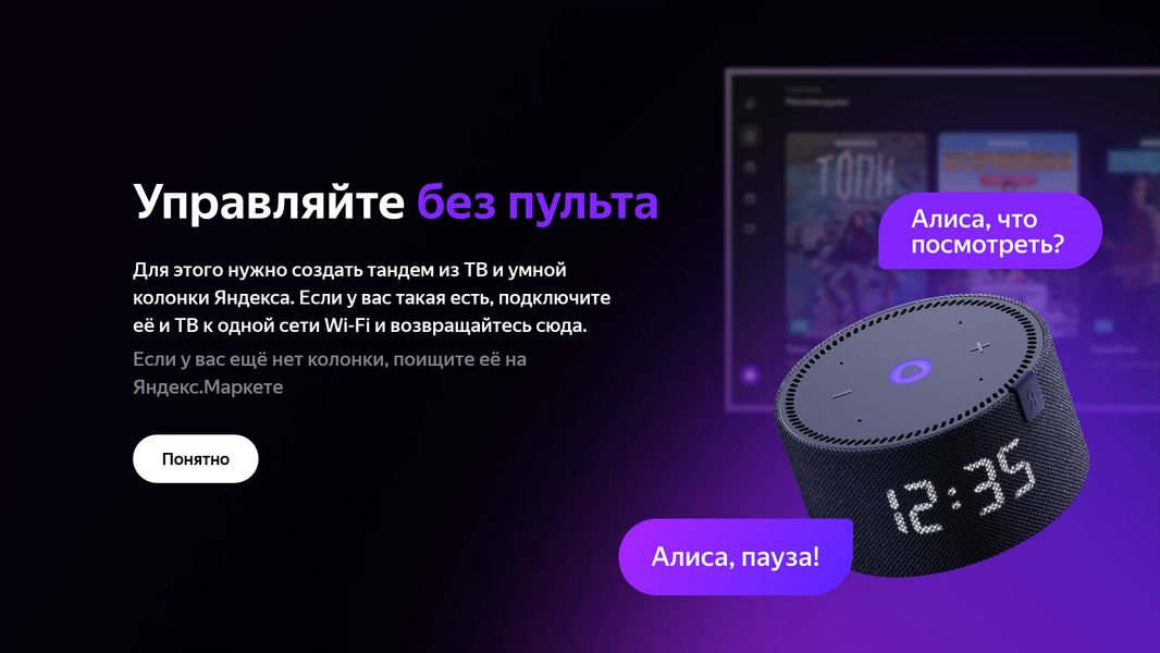 Этот телевизор может работать в тандеме с умной колонкой Яндекса, для этого оба устройства должны быть подключены к одной сети Wi-Fi.