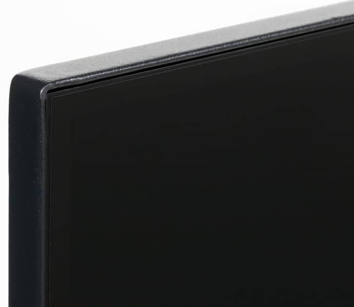 Выведя изображение на экран, можно увидеть, что на самом деле между внешними границами экрана и собственно областью отображения есть неширокие поля (от области отображения до внешних границ экрана сверху и с боков по 7 мм, а снизу — 18 мм). Внешняя поверхность матрицы глянцевая, но при перпендикулярном взгляде видно легкое матовое размытие отраженных объектов. Специального антибликового покрытия нет. Поверхность экрана с виду черная и на ощупь жесткая. Фронтальная поверхность пластиковой планки снизу зеркально-гладкая. Близко к ее левому краю есть неприметный логотип серого цвета.
