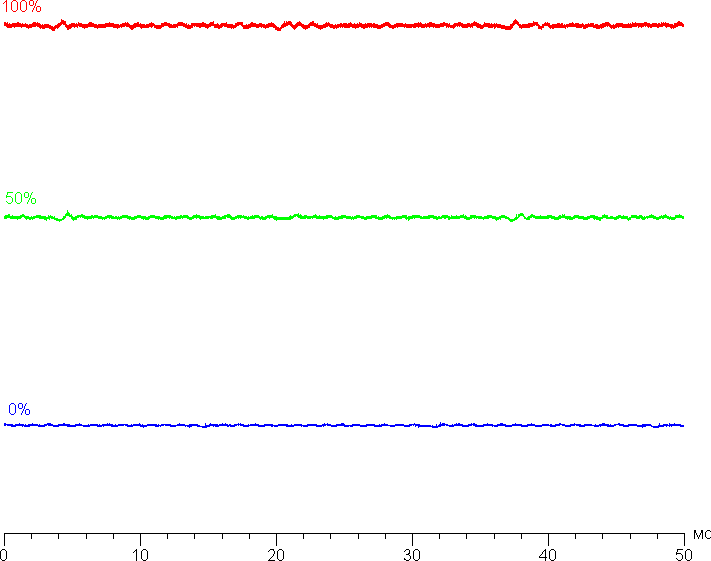 На любом уровне яркости значимая модуляция подсветки отсутствует, поэтому нет и никакого мерцания экрана. Для тех, кто привык распознавать знакомое сокращение, уточним: ШИМ отсутствует. В доказательство приведем графики зависимости яркости (вертикальная ось) от времени (горизонтальная ось) при различных значениях настройки Подсветка: