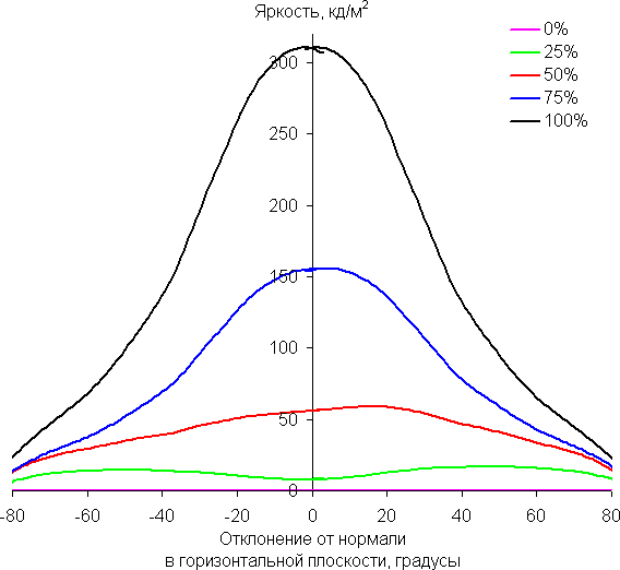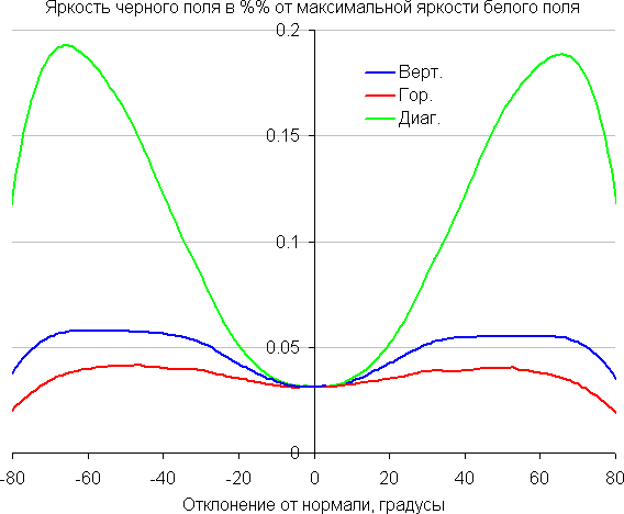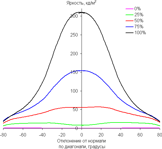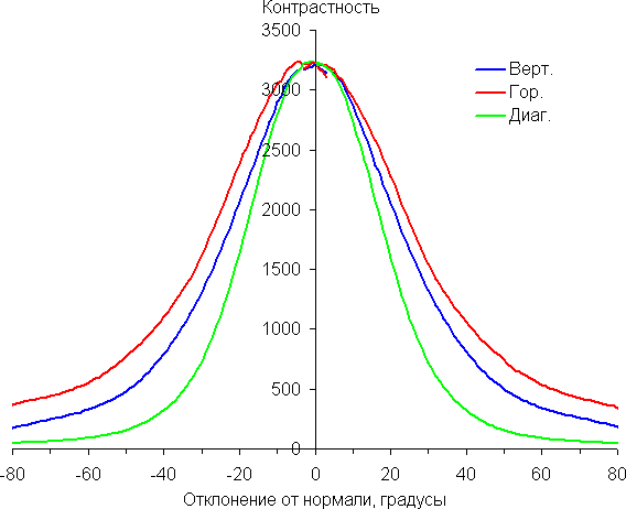 Отметим плавное уменьшение яркости при отклонении от перпендикуляра к экрану во всех трех направлениях. Под очень большими углами графики яркости некоторых полутонов пересекаются, то есть яркость оттенков инвертируется, но в реальной ситуации этого видно не будет. Яркость черного поля при отклонении от перпендикуляра к экрану возрастает, но всего до примерно 0,2% от максимальной яркости белого поля. Это хороший результат. Контрастность в диапазоне углов ±82° не опускается ниже отметки 10:1.