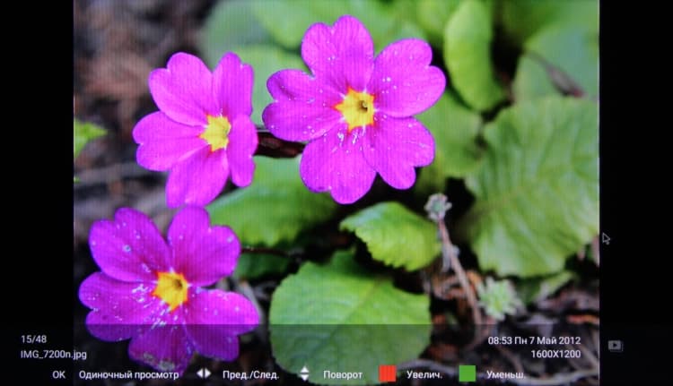 Нами подтверждена способность телевизора показывать растровые графические файлы в форматах JPG, MPO (один ракурс), GIF, PNG и BMP, в том числе в виде слайд-шоу со случайными (и весьма интересными) эффектами перехода.