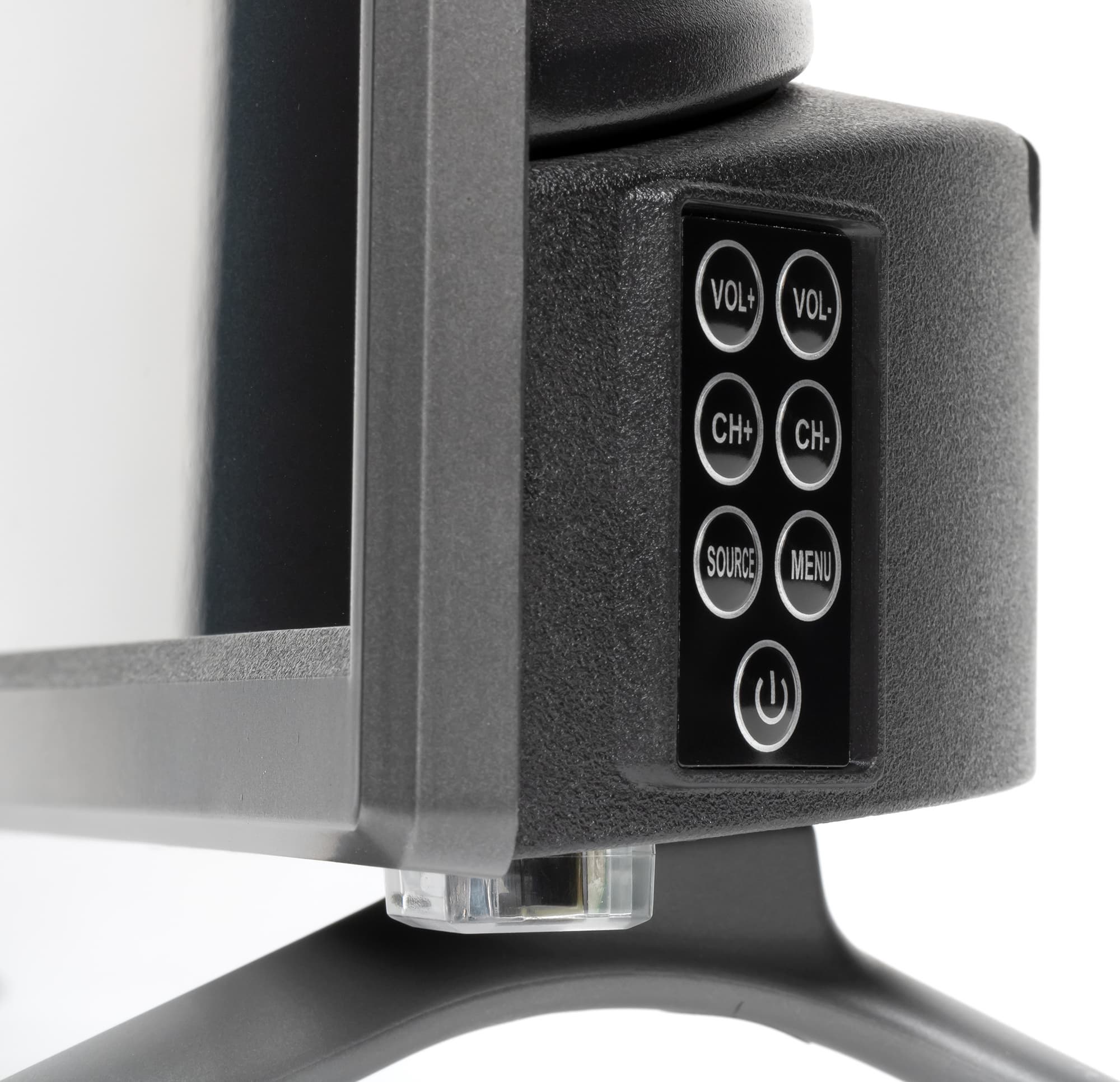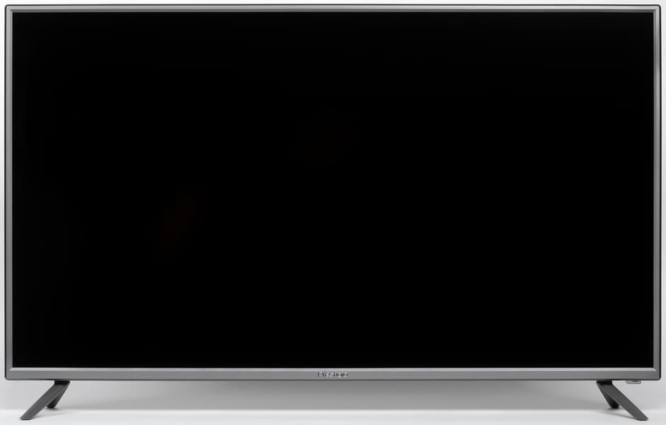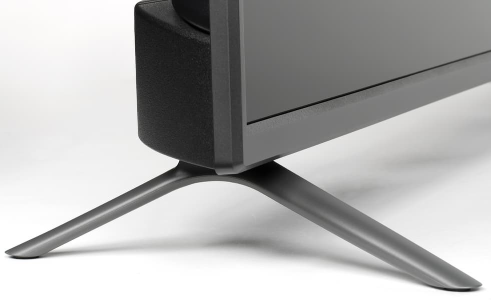 Штатная подставка состоит из двух пластмассовых ножек галочкой, которые винтами прикрепляются к нижнему торцу. Опираются ножки на противоскользящие накладки из упругого пластика. Жесткость конструкции соответствует весу телевизора. Телевизор стоит устойчиво, без видимого наклона. Расстояние между крайними точками ножек 843 мм.
