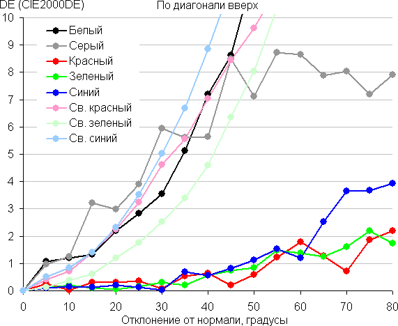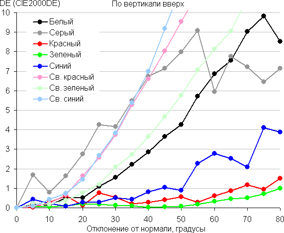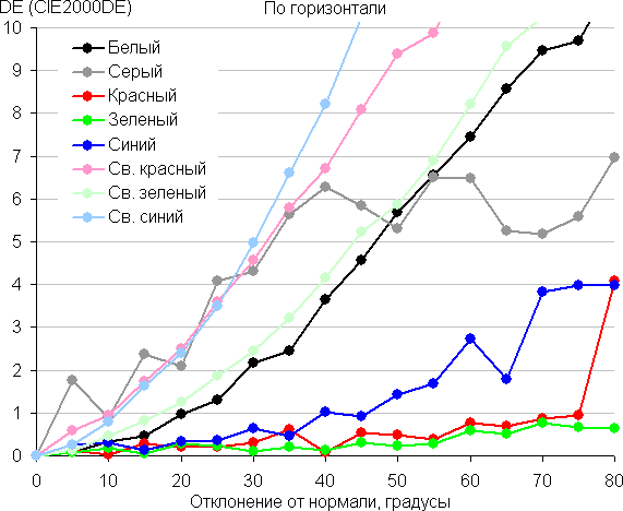 Для количественной характеристики изменения цветопередачи мы провели колориметрические измерения для белого, серого (127, 127, 127), красного, зеленого и синего, а также светло-красного, светло-зеленого и светло-синего полей во весь экран с использованием установки, подобной той, что применялась в предыдущем тесте. Измерения проводились в диапазоне углов от 0° (датчик направлен перпендикулярно к экрану) до 80° с шагом в 5°. Полученные значения интенсивностей были пересчитаны в отклонение ΔE относительно замера каждого поля при перпендикулярном положении датчика относительно экрана. Результаты представлены ниже: