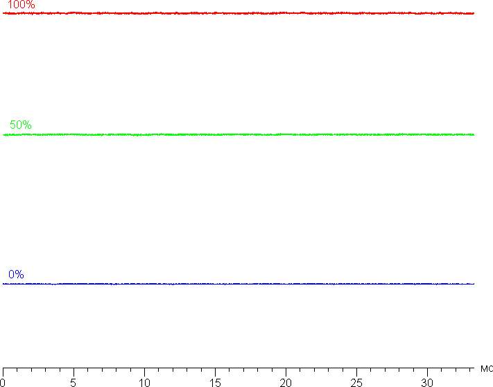 На любом уровне яркости значимая модуляция подсветки отсутствует, поэтому нет и никакого мерцания экрана. В доказательство приведем графики зависимости яркости (вертикальная ось) от времени (горизонтальная ось) при различных значениях настройки Подсветка: