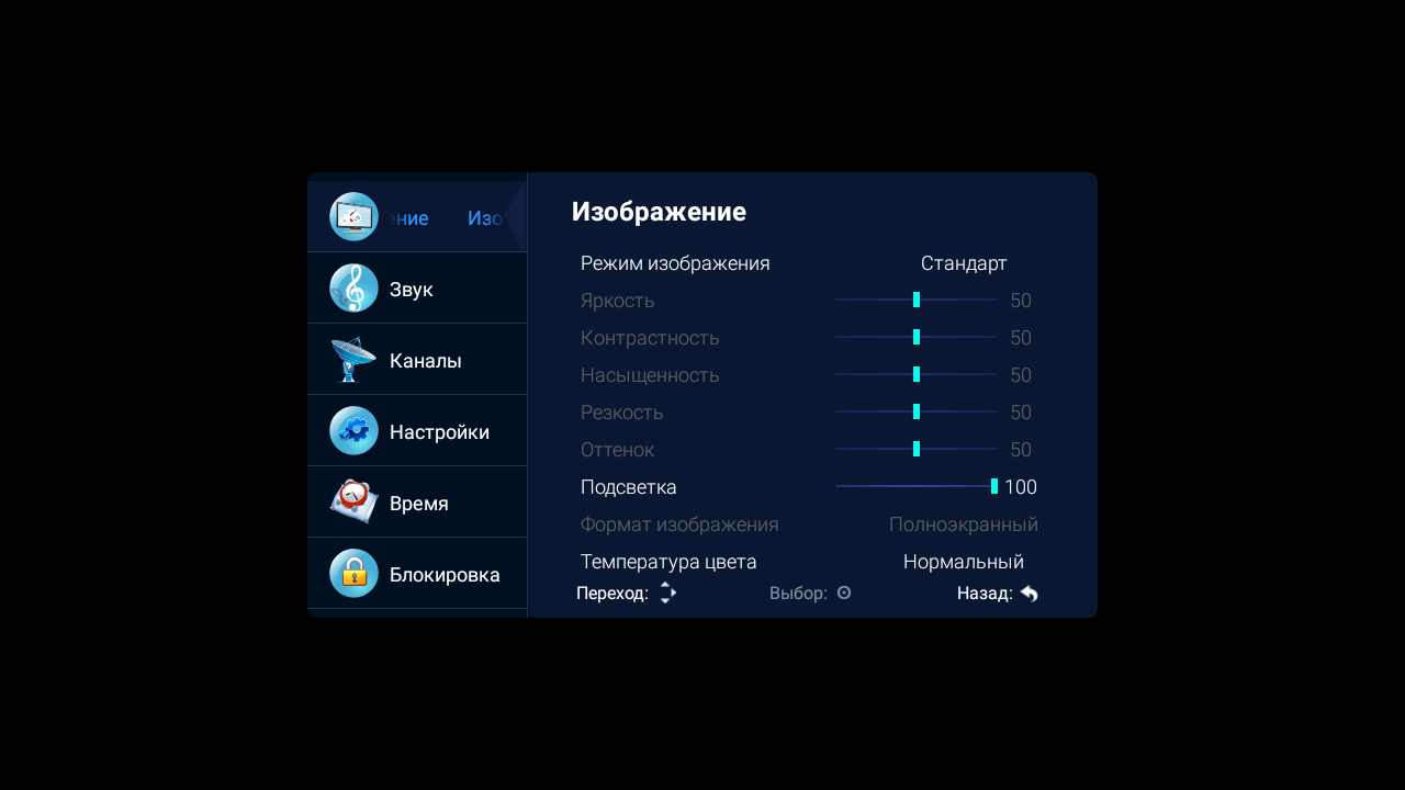 Второе меню выводится на экран при нажатии на кнопку Menu пульта и только в случае приема изображения от внешних источников сигнала и ТВ-тюнеров. Оно содержит настройки изображения, звука, ТВ-тюнеров и т. д.