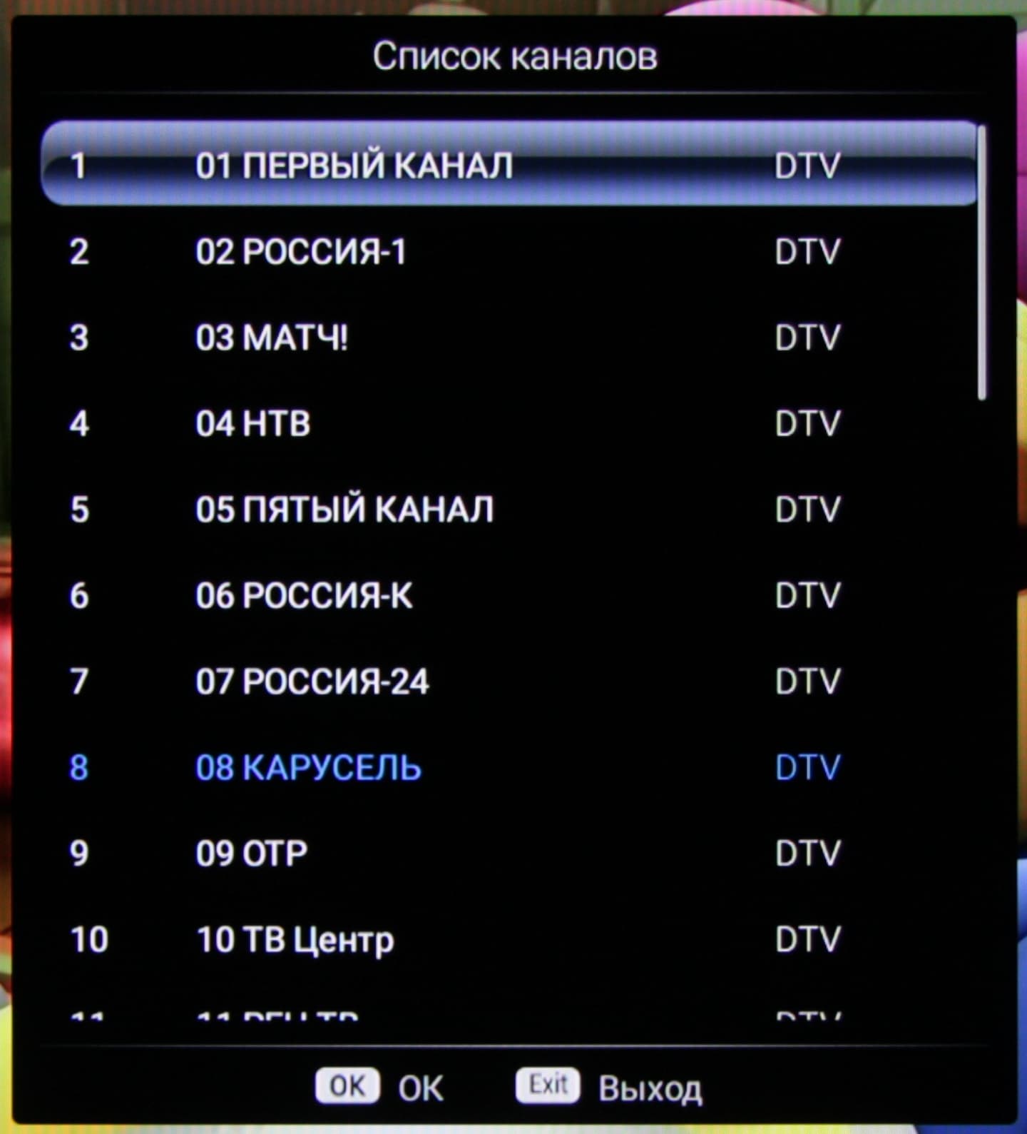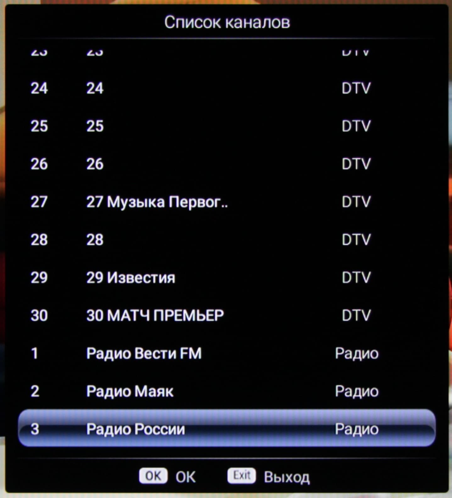 Данная модель, помимо спутникового тюнера, оснащена тюнером, принимающим аналоговый и цифровой сигнал эфирного и кабельного вещания. Качество приема цифровых каналов на дециметровую антенну, закрепленную на стене здания (почти прямая видимость в направлении на телевышку в Бутово, расположенную на расстоянии 14 км), было на высоком уровне. Удалось найти ТВ-каналы во всех трех мультиплексах (всего 30 и 3 канала радио).