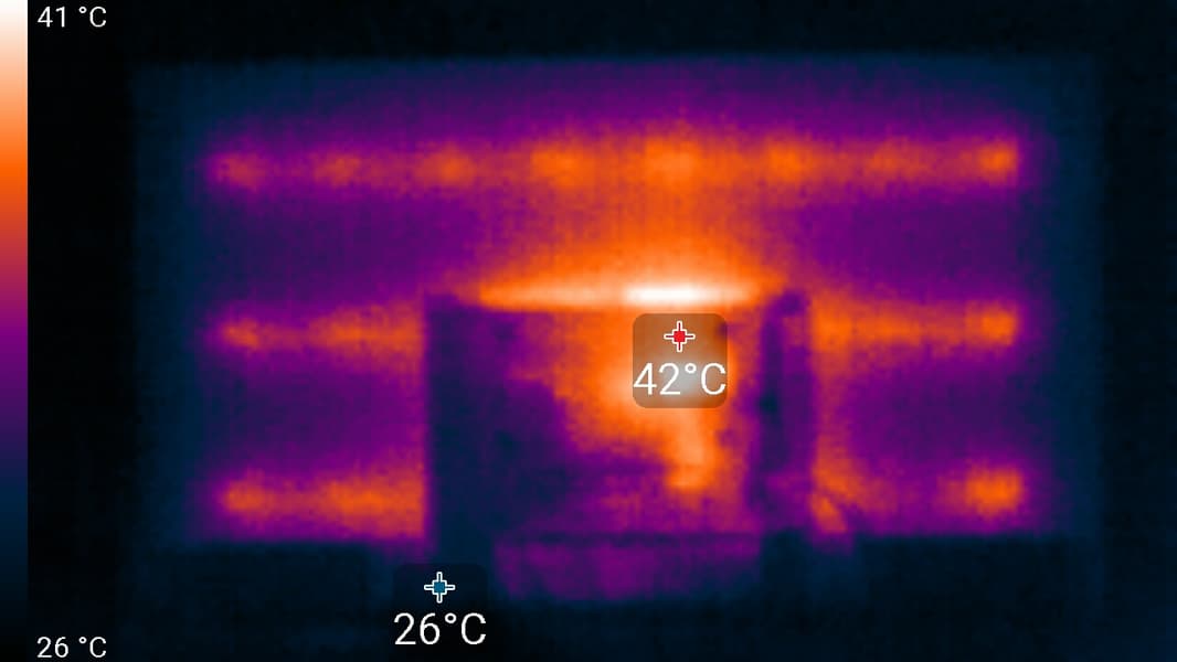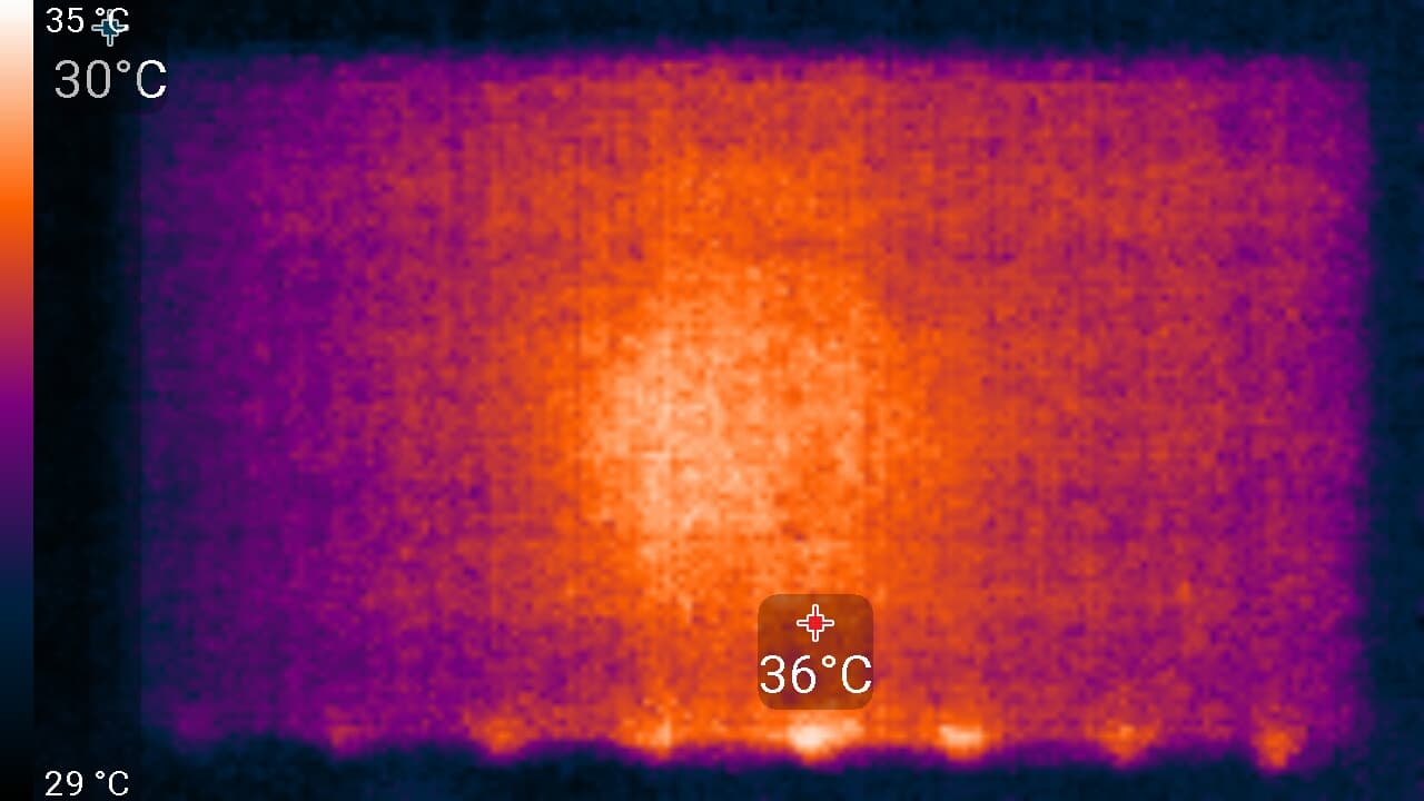 Видно, что основным источником тепла являются область примерно в центре экрана и 8 точек внизу у рамки. По всей видимости, в данном телевизоре используется не краевая, а задняя подсветка (с горизонтальными полосками из светодиодов), неподеленная на независимо управляемые зоны.