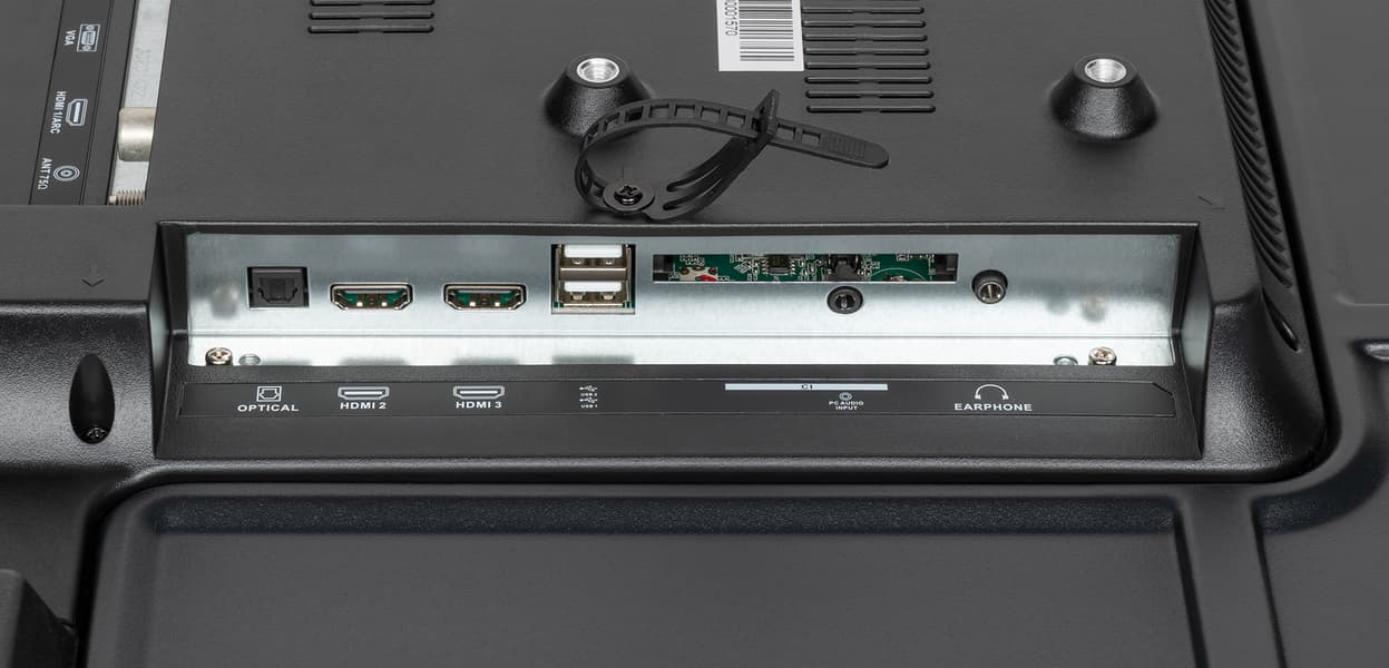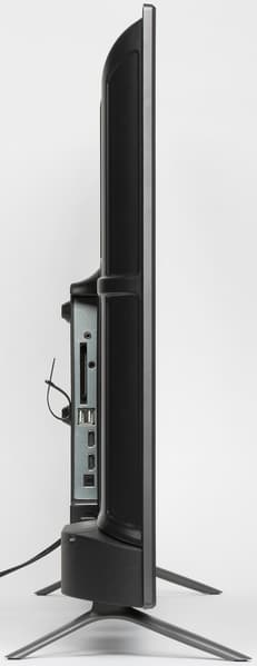 Задняя панель условно в верхней части изготовлена из тонкого листа стали и имеет стойкое черное матовое покрытие. Выступающий назад кожух в нижней-центральной части с заходом на нижний торец изготовлен из черного пластика с матовой поверхностью. На этом кожухе сверху и сзади есть вентиляционные решетки. Интерфейсные разъемы размещены в двух незамкнутых нишах. Часть разъемов направлена вниз, часть вбок. Спереди дотягиваться до разъемов, направленных вбок, например, до разъема для наушников далеко, но относительно удобно. Кабели от этих разъемов можно вывести вниз даже если телевизор плотно прижат к стене, так как ниже есть подходящее углубление. Подключать кабели к разъемам, направленным вниз, также несложно, так как кабели не приходится выгибать, и их спокойно можно пустить вниз. Тонким телевизор назвать сложно.