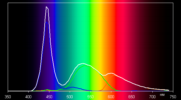 Такой спектр с относительно узким пиком синего и с широкими горбами зеленого и красного цветов характерен для мониторов, в которых используется белая светодиодная подсветка с синим излучателем и желтым люминофором.