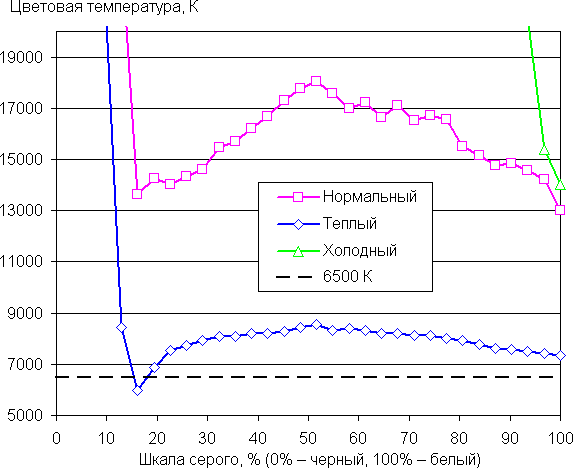 Графики ниже показывают цветовую температуру на различных участках шкалы серого и отклонение от спектра абсолютно черного тела (параметр ΔE) для трех предустановленных профилей настройки цветовой температуры: