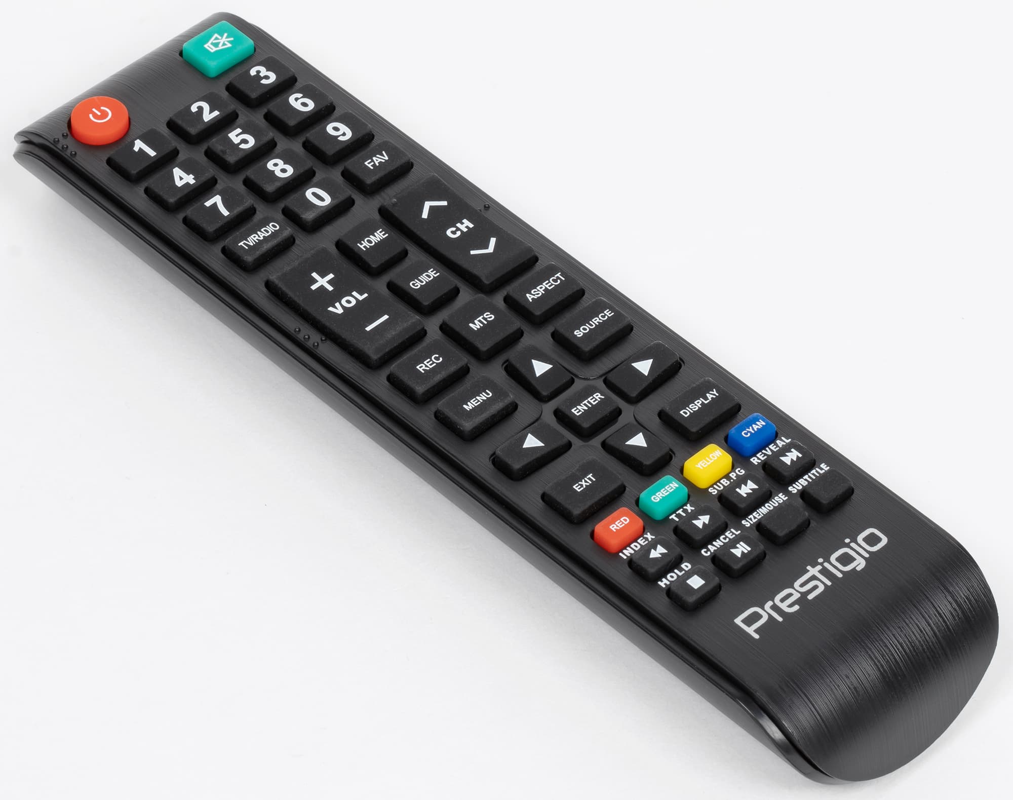 Корпус пульта изготовлен из черного пластика с матовой поверхностью, а кнопки — из резиноподобного материала. Пульт удобно лежит в руке. Кнопок много, их обозначения контрастные и большинство достаточно крупные. Однако ряд вспомогательных кнопок в задней части очень мелкие, как и их обозначения. Есть две кнопки-качалки изменения громкости и переключения ТВ-каналов, которые легко находятся на ощупь. Подсветки, конечно, нет. Работает пульт по ИК.