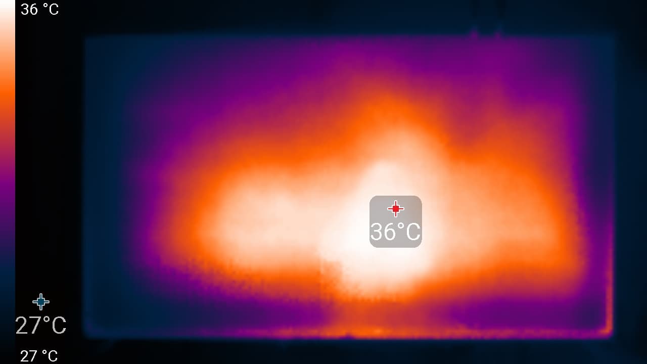 Нагрев телевизора можно оценить по приведенному снимку с ИК-камеры, полученному после долговременной работы на максимальной яркости в помещении с температурой примерно 24 °C:
