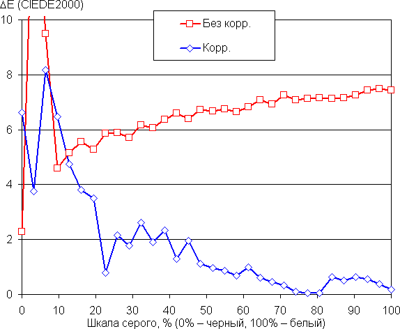 Самый близкий к черному диапазон можно не учитывать, так как в нем цветопередача не так важна, а погрешность измерения цветовых характеристик высокая. Цветовая температура в профиле с максимальной яркостью высоковата, но после ручной коррекции цветовая температура уже близка к стандартным 6500 К, а ΔE также снизилось, при этом оба параметра мало изменяется от оттенка к оттенку на значимой части шкалы серого, что положительно сказывается на визуальной оценке цветового баланса. Впрочем, с практической точки зрения заниматься коррекцией особого смысла нет, так как максимальная яркость после коррекции понижается (до 250 кд/м²). Вполне можно оставить вариант по умолчанию, благо в нем вариация цветовой температуры и ΔE невелика, а это в данном случае важнее, чем их абсолютные значения.