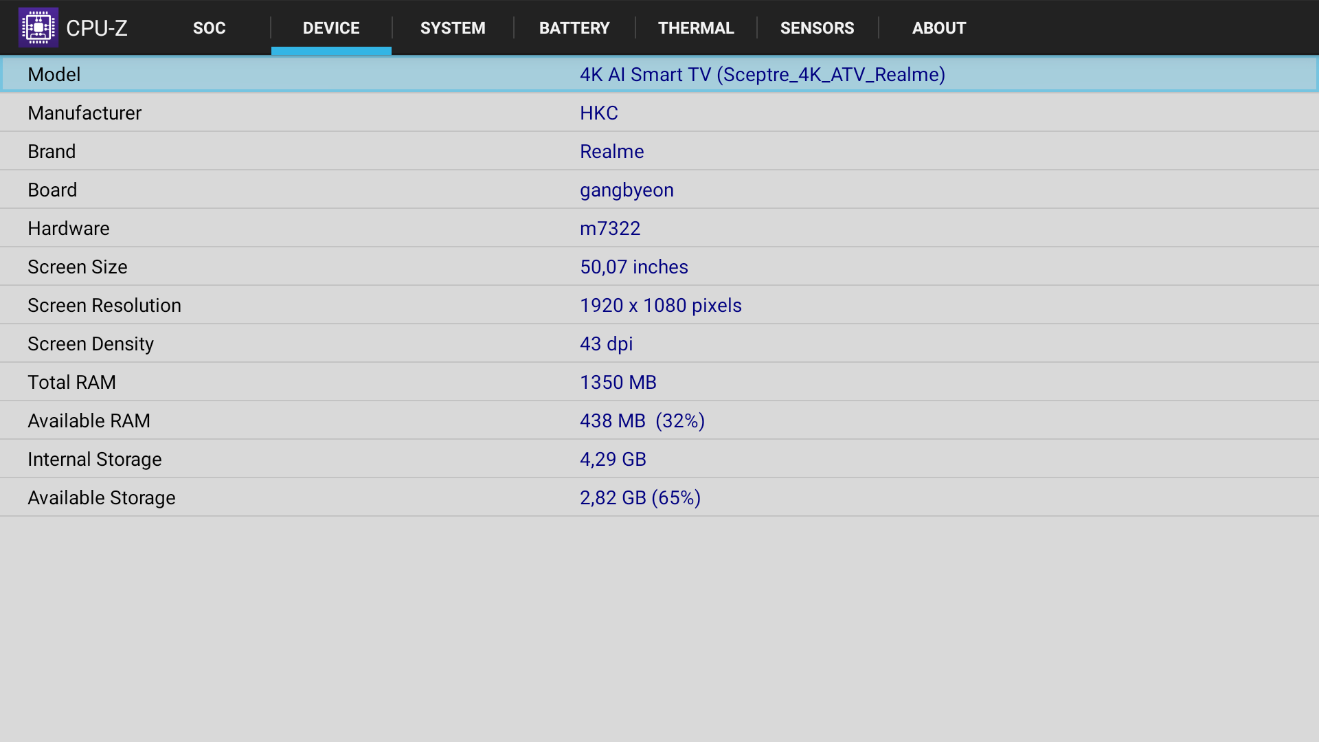 Программной платформой для этого ТВ служит операционная система Android TV, основанная на Android версии 9.0. Конфигурацию аппаратной части поясняют данные программы CPU-Z: