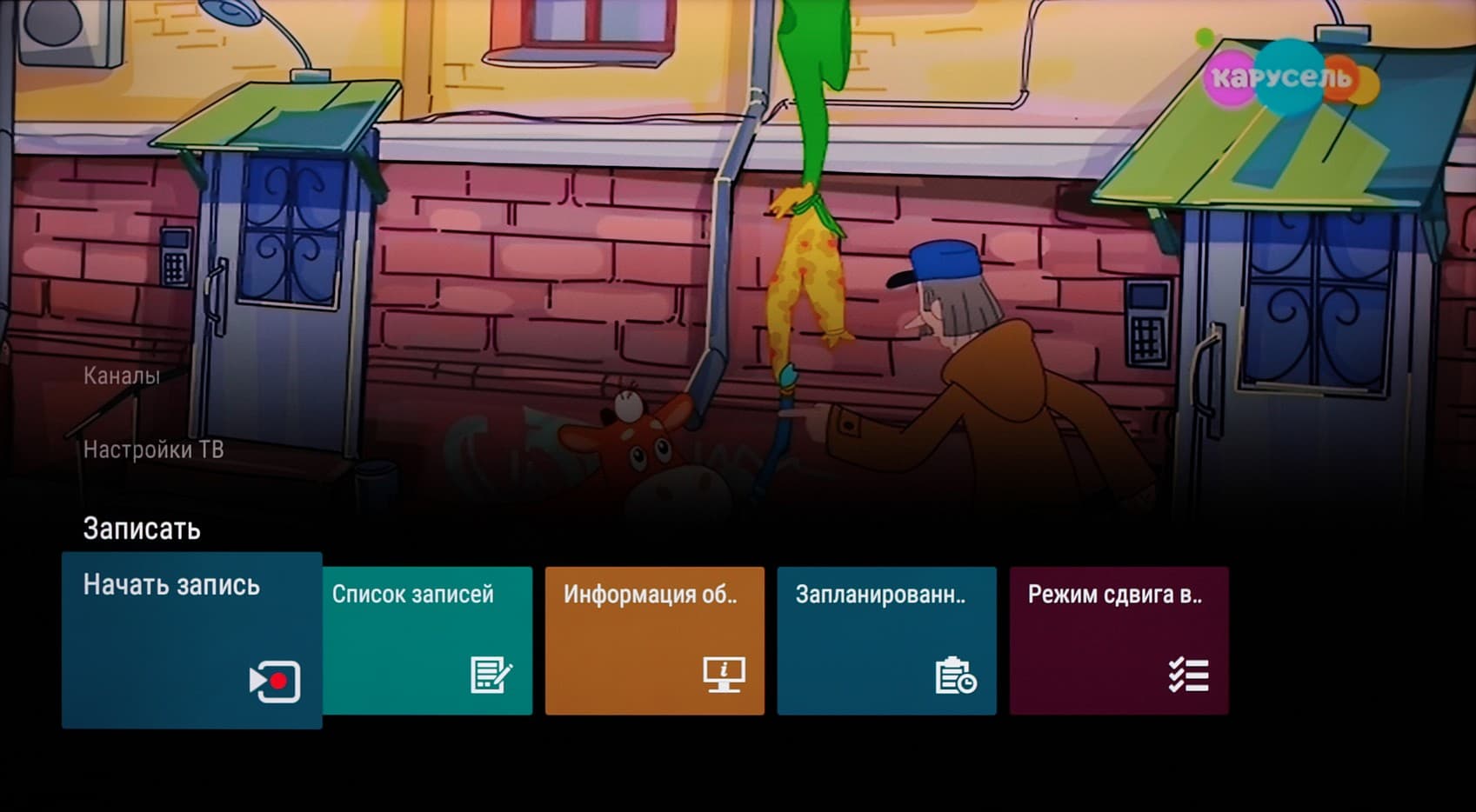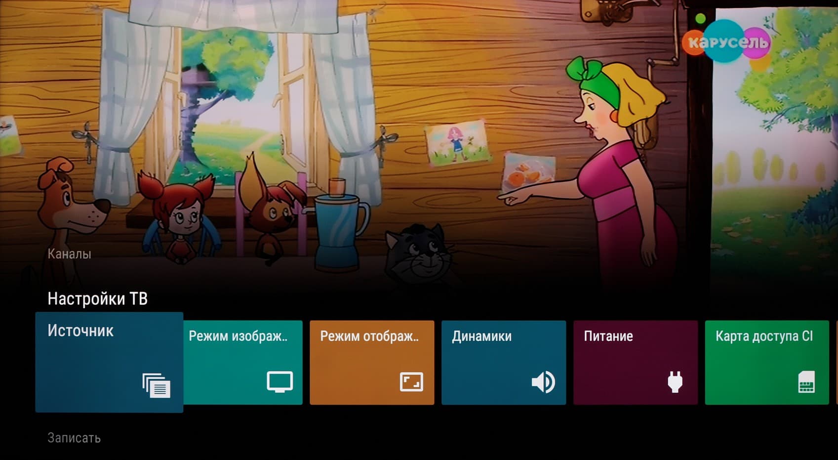 Доступ к настройкам также удобно получить из контекстного меню с плитками, которое можно вывести на экран при просмотре ТВ-каналов или внешних источников видеосигнала.