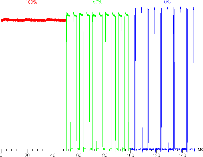 Управление яркостью свечения подсветки осуществляется с помощью ШИМ с частотой 200 Гц. Ниже приведена зависимость яркости от времени, числа — это значения настройки Подсветка: