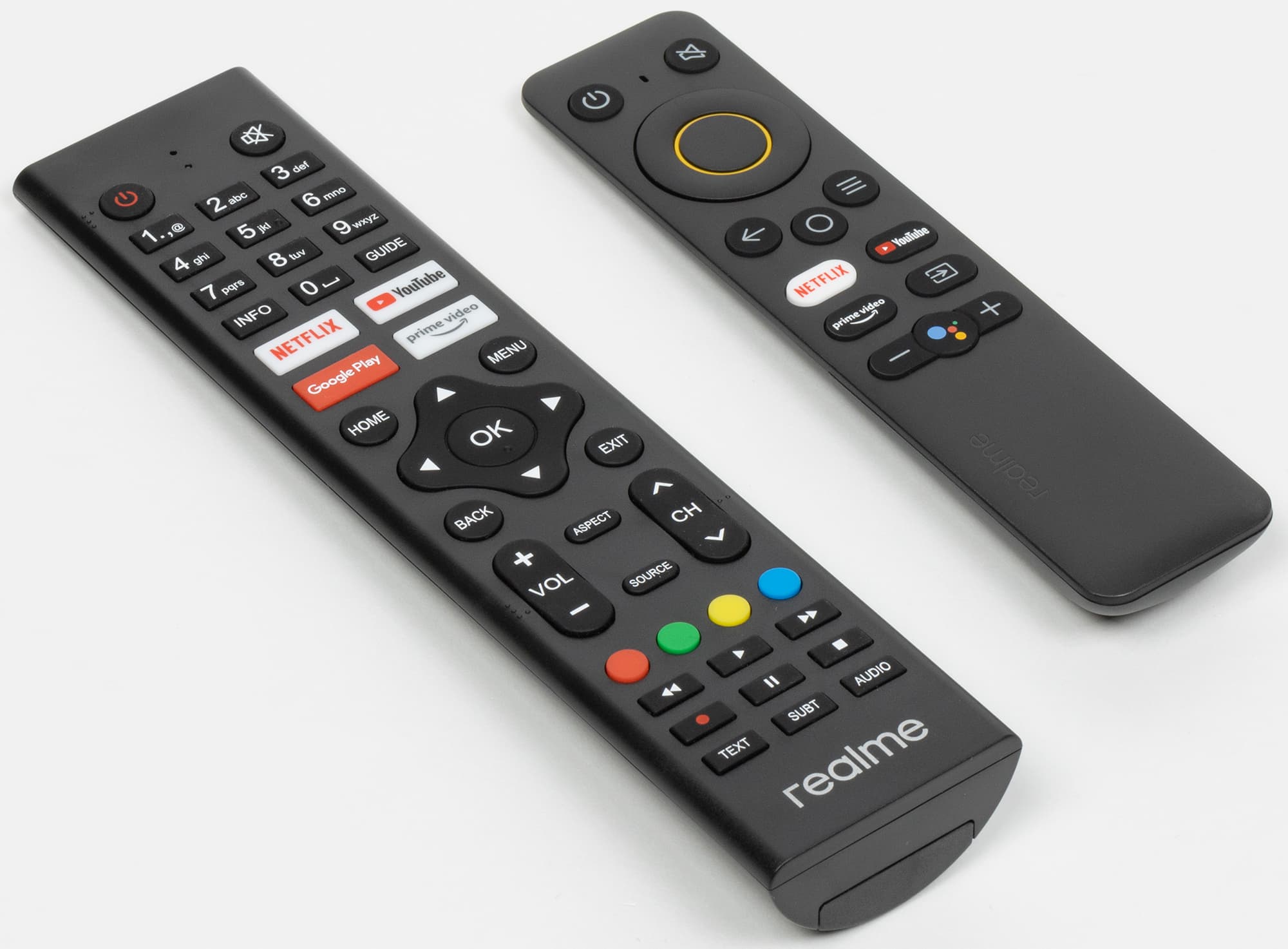 К телевизору прилагается сразу два пульта, оба требуют по паре элементов питания типа ААА, которых в комплекте нет. Один побольше с бо́льшим количеством кнопок и второй поменьше и с меньшим числом кнопок. Первый работает по ИК, второй — преимущественно по Bluetooth, что, конечно, само по себе удобнее. Таким образом, зрителю дается свобода выбора, каким пультом ему пользоваться. Кроме того второй пульт будет запасным на случай, если первый потеряется или сломается. Корпуса пультов изготовлены из черного пластика с матовой поверхностью, а почти все кнопки — из резиноподобного материала, исключение — кнопка выбора и кольцо курсорных кнопок на меньшем пульте. На обоих пультах есть кнопки для быстрого запуска ряда приложений, которые по сути только занимают место и иногда отнимают у пользователя время из-за случайного запуска (или попытки запуска в случае Netflix) программы.