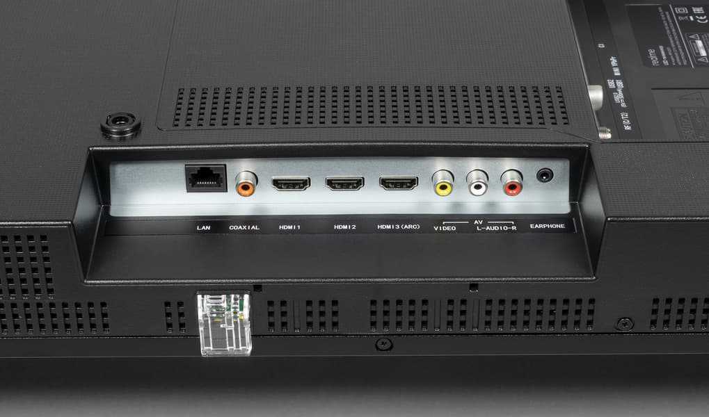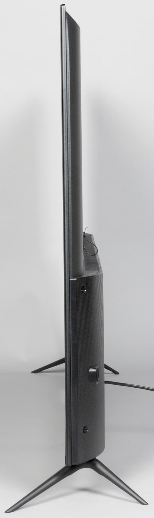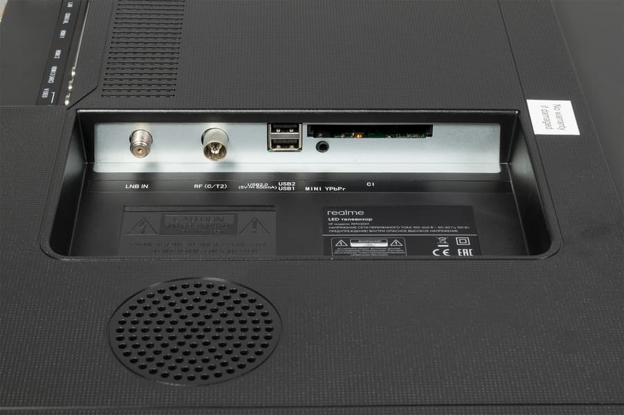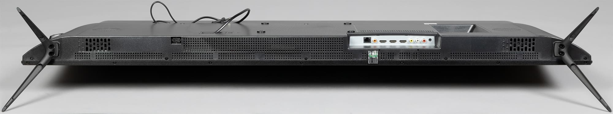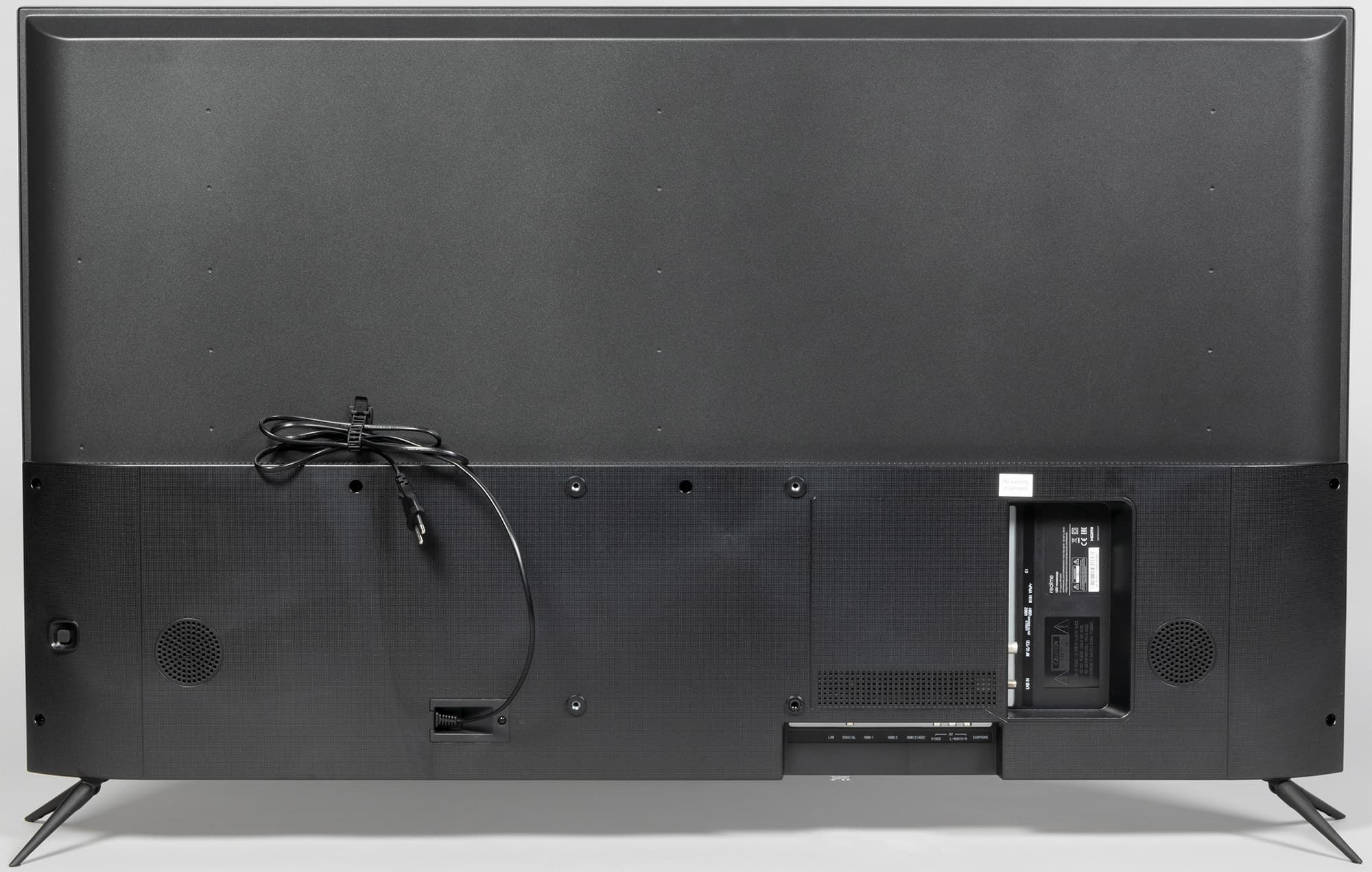 Задняя панель в верхней части изготовлена из тонкого листа стали и имеет стойкое черное матовое покрытие. Выступающий назад кожух в нижней части с заходом на нижний торец изготовлен из черного пластика с матовой поверхностью. На большей части площади этого кожуха есть рельеф в виде мелких пупырышков. Интерфейсные разъемы размещены в двух нишах. Часть разъемов направлена вниз, часть вбок. Подключать кабели к разъемам неудобно. Скорее, даже очень неудобно, а расположение разъема для подключения наушников ничего, кроме недоумения не вызывает. В верхней части телевизор относительно тонкий.