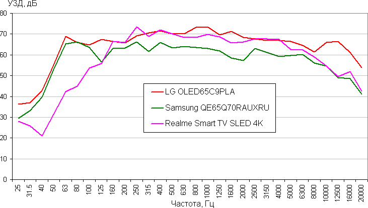 Громкость встроенной акустической системы для жилой комнаты, соответствующей по размерам данной диагонали экрана, достаточная, есть даже большой запас. Стереофонический эффект распознать можно. Присутствуют высокие и средние частоты, низких — совсем немного. Явно есть паразитные резонансы корпуса, но даже на максимальной громкости нет значительных искажений сигналов с высоким уровнем. В целом для класса встроенной в телевизор акустики ее качество приемлемое. Сравним АЧХ этого ТВ с АЧХ двух телевизоров высшего класса (получена с помощью шумомера при воспроизведении звукового файла с розовым шумом, интервал УЗД в 1/3 октавах):