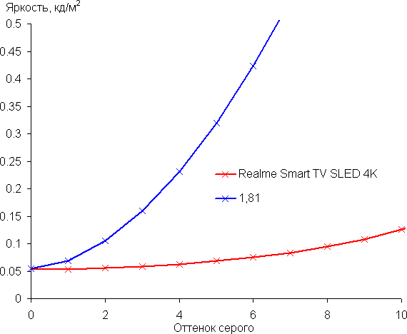 Рост прироста яркости более-менее равномерный только на небольшом участке в середине, впрочем, почти каждый следующий оттенок ярче предыдущего, кроме первого оттенка серого, который по яркости не отличается от черного: