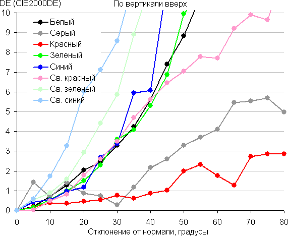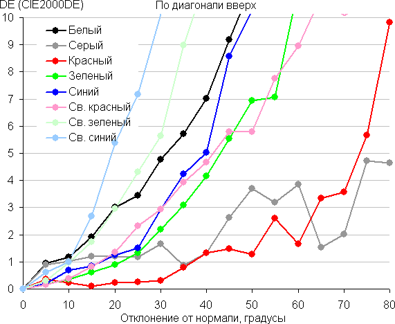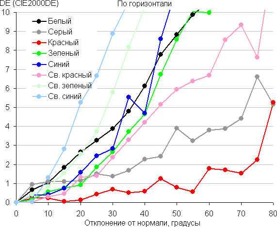 Для количественной характеристики изменения цветопередачи мы провели колориметрические измерения для белого, серого (127, 127, 127), красного, зеленого и синего, а также светло-красного, светло-зеленого и светло-синего полей во весь экран с использованием установки, подобной той, что применялась в предыдущем тесте. Измерения проводились в диапазоне углов от 0° (датчик направлен перпендикулярно к экрану) до 80° с шагом в 5°. Полученные значения интенсивностей были пересчитаны в отклонение ΔE относительно замера каждого поля при перпендикулярном положении датчика относительно экрана. Результаты представлены ниже: