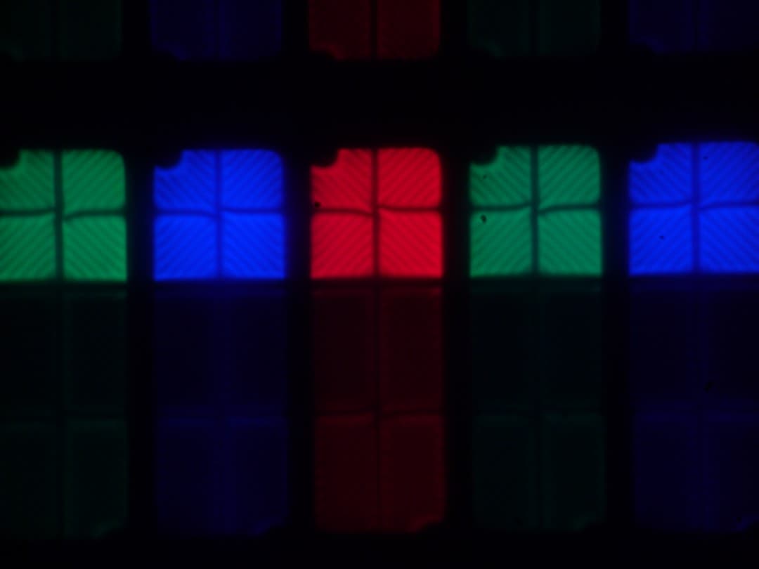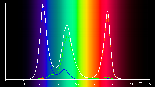 Видно, что спектры компонент хорошо разделены, что и позволяет получить широкий цветовой охват. Перекрестное подмешивание есть, возможно, оно обусловлено шириной пропускания светофильтров, а не программной коррекцией. Напомним, что производитель заявляет от цветовом охвате в 108% от пространства NTSC, который достигается за счет использования технологии SLED. Возможно, суть этой технологии в том, что в подсветке используются раздельные светодиоды красного, синего и зеленого свечения.