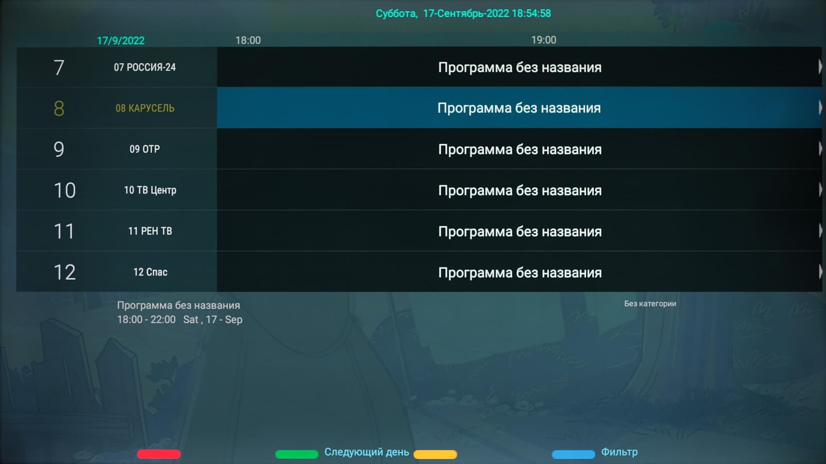 Присутствуют четыре списка избранных программ. Формально есть поддержка электронной программы передач, но с прошивкой на момент тестирования таблица программы не заполнялась информацией о передачах.
