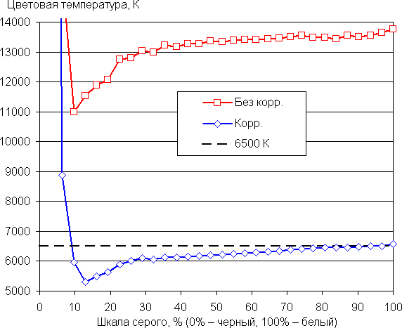 Графики ниже показывают цветовую температуру на различных участках шкалы серого и отклонение от спектра абсолютно черного тела (параметр ΔE) для профиля Пользовательские настройки без коррекции (при этом обеспечивается максимальная яркость и контрастность) и после ручной коррекции (настройки усиления для красного, зеленого и синего цветов — 0/−19/−55):