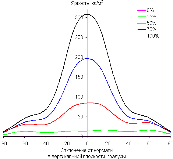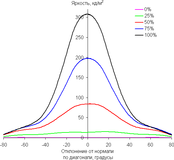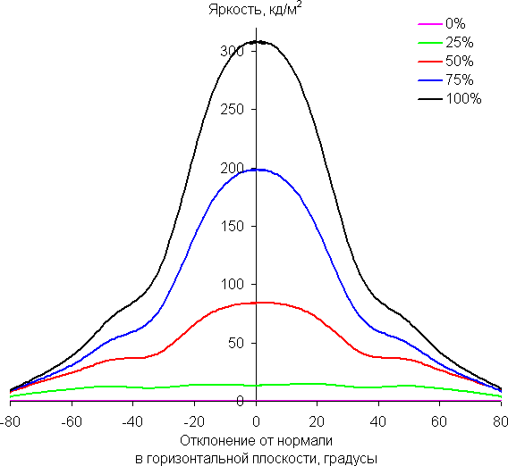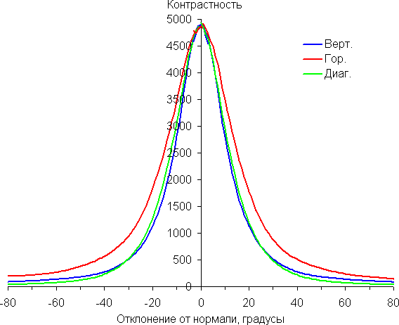 По скорости снижения яркости углы обзора не очень широкие. Яркость черного поля при отклонении от перпендикуляра к экрану возрастает, но всего до примерно 0,13% от максимальной яркости белого поля и только при большом отклонении. Это отличный результат. Контрастность в диапазоне углов ±82° для двух направлений значительно превышает 10:1. Для диагонального направления контрастность при отклонении снижается быстрее, но все равно не опускается за эту отметку.