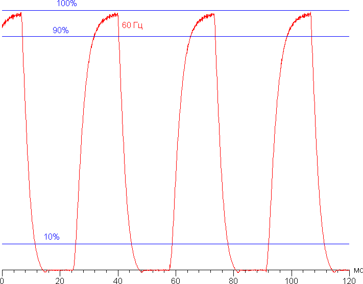 Скорости матрицы более чем достаточно для полноценного вывода изображения с частотой 60 Гц. В подтверждение приведем зависимость яркости от времени при чередовании белого и черного поля (на части площади экрана) при 60 Гц кадровой частоты (график с подписью 60 Гц):