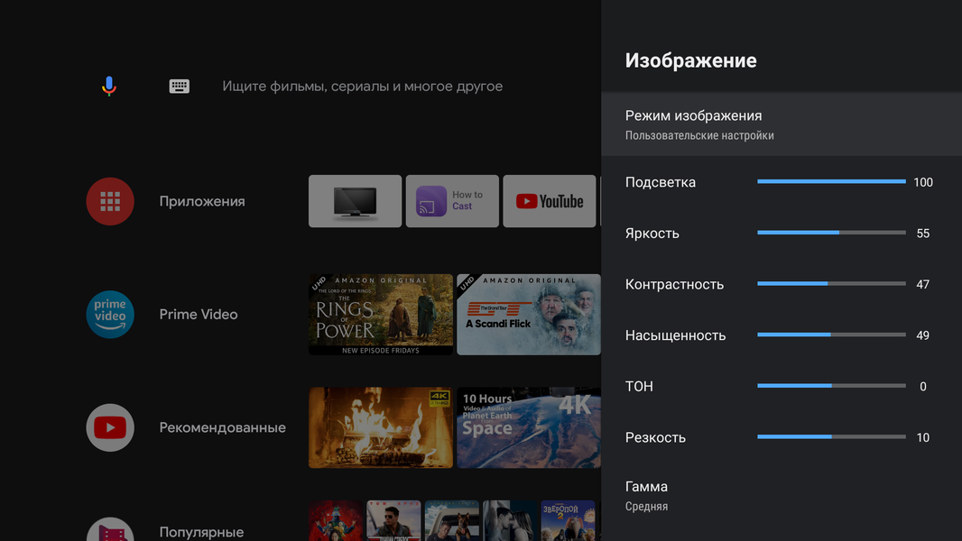 Также настройки изображения доступны в штатном плеере. Тогда как в случае, сторонних программ при нажатии на кнопку вызова настроек выводится контекстное меню этой программы и менять настройки изображения уже не получится. Меню с настройками занимает большую часть экрана, что в ряде случаев затрудняет оценку вносимых в изображение изменений. Настройки изображения сохраняются раздельно как минимум для двух групп — для всех приложений и для всех внешних входов, включая ТВ-тюнер. Интерфейс переведен на русский язык, качество перевода хорошее. Отметим, что в целом ни к стабильности работы, ни к отзывчивости оболочки у нас особых претензий не возникло.