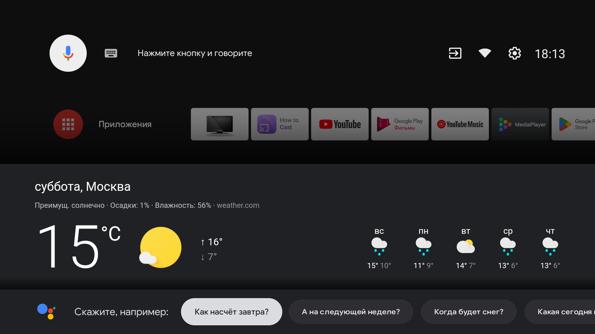 В передней части пульта есть отверстие микрофона. Голосовой помощник от Google запускается при нажатии на кнопку с цветастыми кружками (для ввода голосовой команды держать ее не нужно), также его можно запустить с домашней страницы. Этот помощник поможет найти контент, который предоставляют ряд программ, и ответить на какие-то вопросы (показывает и проговаривает ответ), например, какая сейчас погода за окном.