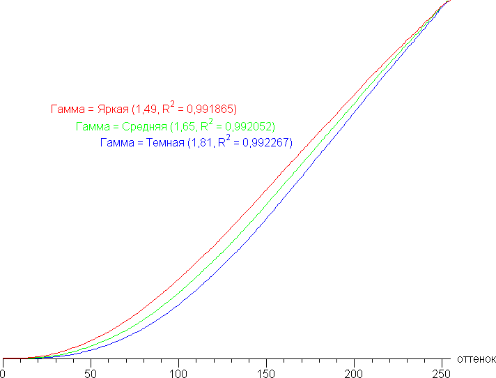 Для оценки характера роста яркости на шкале серого мы измерили яркость 17 оттенков серого при различных значениях параметра Гамма. На графике ниже приведены полученные гамма-кривые (значения показателей аппроксимирующей функции приведены в скобках в подписях, там же — коэффициент детерминации):