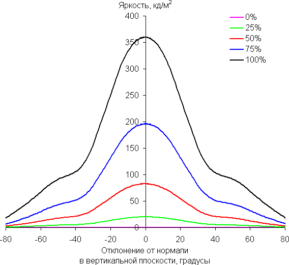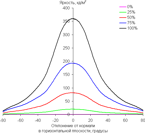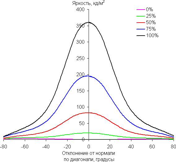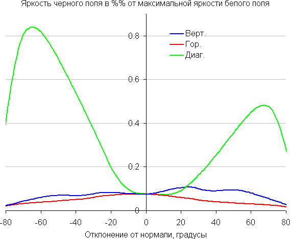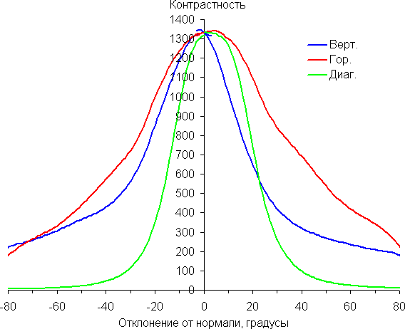 По скорости снижения яркости углы обзора не очень широкие. При отклонении в диагональном направлении яркость черного поля начинает резко возрастать уже при 20°-30° отклонения от перпендикуляра к экрану. Если сидеть недалеко от экрана, то черное поле по углам будет заметно светлее, чем в центре, но оставаясь при этом условно нейтрально-серым. Контрастность в диапазоне углов ±82° в случае отклонения по диагонали приближается к отметке 10:1 и по одной диагонали опускается ниже при 65°.