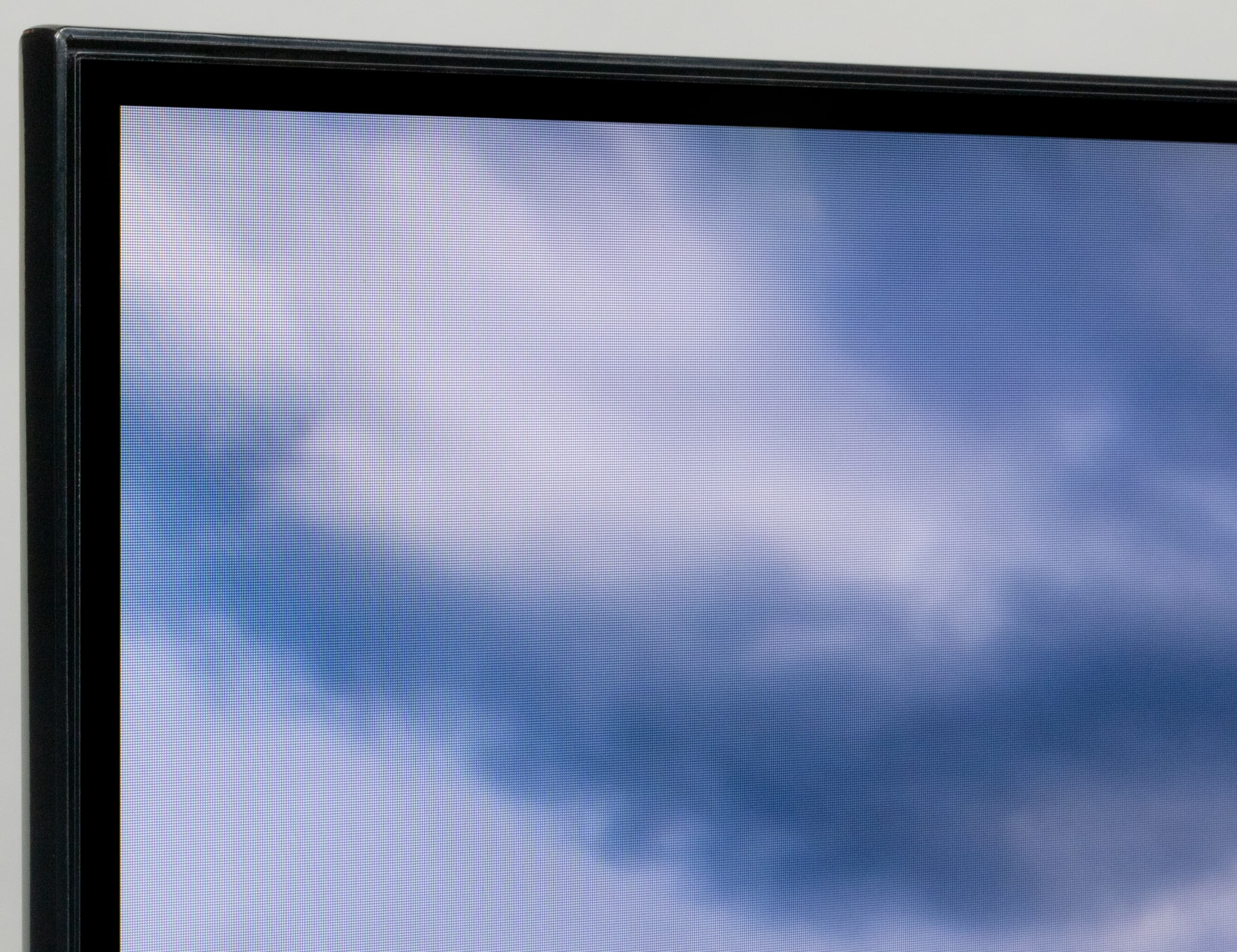 Окантовка черная, а планка темно-темно-серая с фиолетовым отливом. Поверхность планки и окантовки зеркально-гладкая. Планка и окантовка могут бликовать — отражать источники света, — что может слегка отвлекать зрителя. Выведя изображение на экран, можно увидеть, что на самом деле между внешними границами экрана и собственно областью отображения есть неширокие поля: от области отображения до внешних границ экрана сверху и с боков — по 9 мм, а снизу до планки — 3 мм.