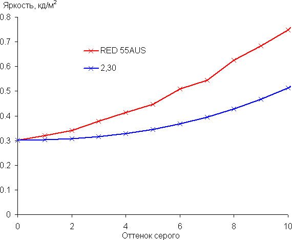 Рост прироста яркости более-менее равномерный, и каждый следующий оттенок значимо ярче предыдущего, даже в самой темной области: