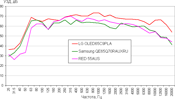 Громкость встроенной акустической системы для жилой комнаты, соответствующей по размерам данной диагонали экрана, достаточная. Стереофонический эффект выражен хорошо. Присутствуют высокие и средние частоты, низких — немного. Явно есть паразитные резонансы корпуса, но даже на максимальной громкости нет значительных искажений сигналов с высоким уровнем. В целом для класса встроенной в телевизор акустики ее качество неплохое. Сравним АЧХ этого ТВ с АЧХ двух телевизоров высшего класса (получена с помощью шумомера при воспроизведении звукового файла с розовым шумом, интервал УЗД в 1/3 октавах):